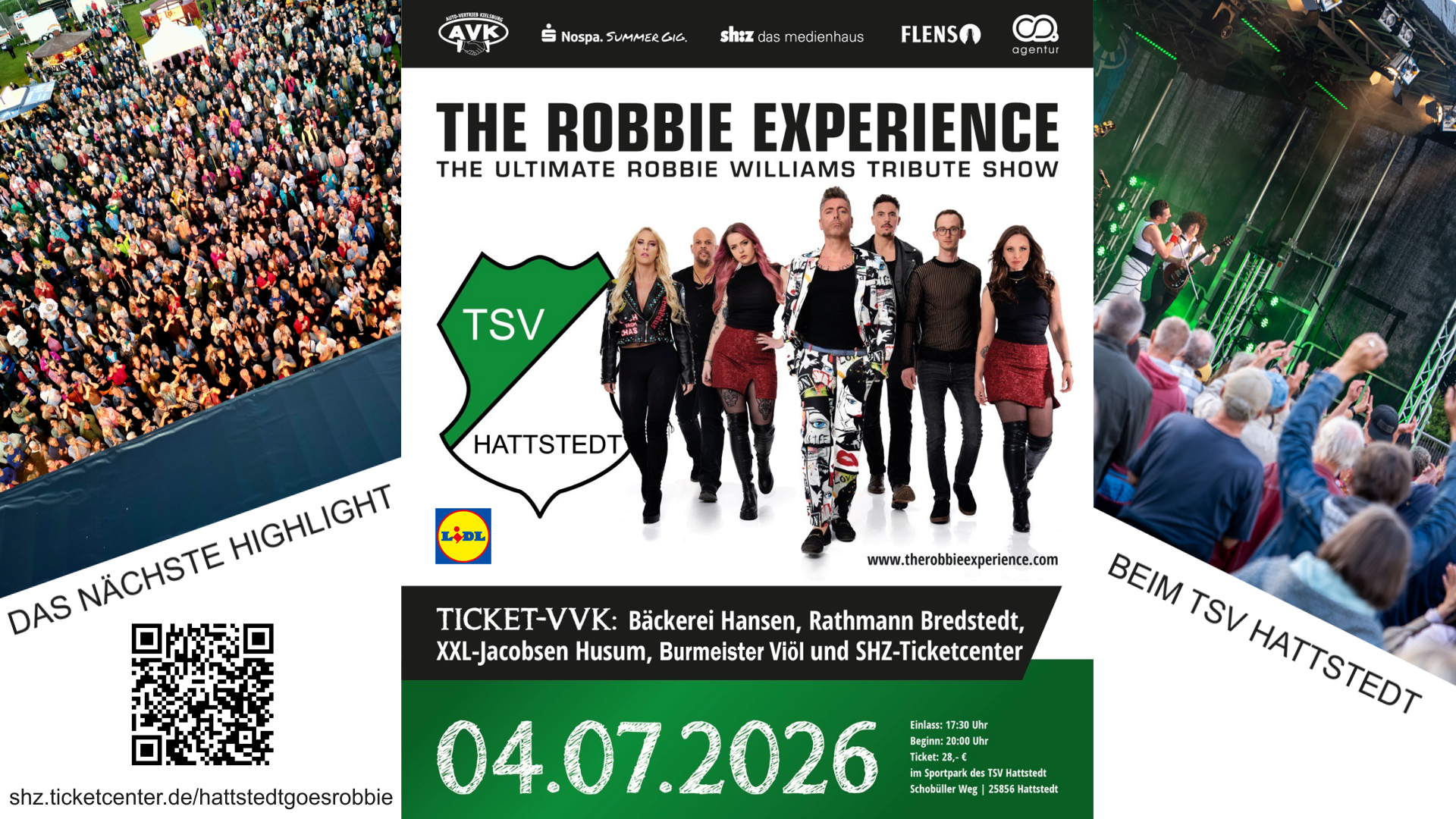 Nach 2019 und 2022 mit der tschechischen Queenie-Band, vor jeweils ca. 2.500 Gästen, folgt nun das 3. Benefizkonzert in Hattstedt zugunsten der Jugend des TSV Hattstedt und des Fonds „Familien in Not“ Nordfriesland. Wir wollen dieses Jahr mit der Top-Band Robbie Experience, Gewinnerin der SAT.1-Show „THE TRIBUTE“ im Jahr 2024 wieder ausverkauft sein – denn viel hilft viel! Ein schöner Abend unter Freunden erwartet euch am 04.07.2026!