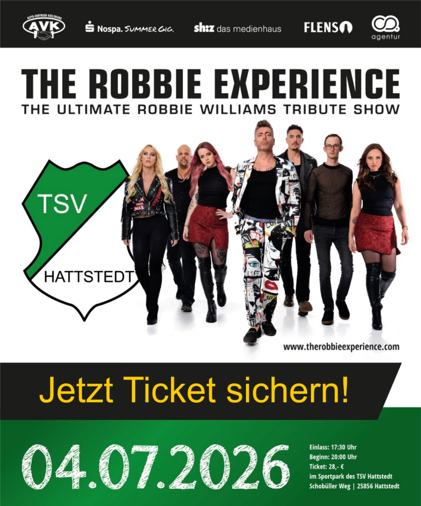 shz.ticketcenter.de/hattstedtgoesrobbie Am 04.07.2026 ist es soweit, der TSV Hattstedt startet mit seinem nächsten Event: THE ROBBIE EXPERIENCE, ein Tribute an Robbie Williams. Nach 2019 und 2022 mit der tschechischen Queenie-Band, vor jeweils ca. 2.500 Gästen, folgt...